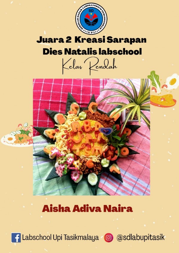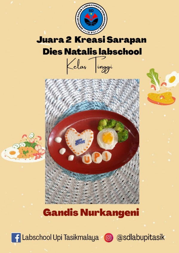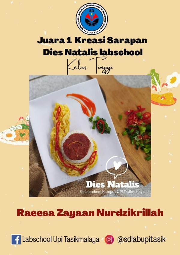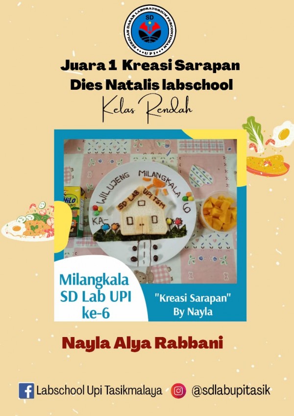 Berikut ini adalah juara terpilih dari berbagai karya terbaik yang dipersembahkan oleh ananda SD Laboratorium UPI Tasikmalaya. Juara Kreasi sarapan ini dikategorikan menjadi dua kategori yaitu kelas tinggi dan kelas rendah. Selamat kepada yang terpilih dan tetap rendah hati.