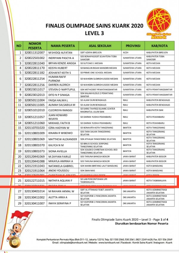 Nathifa Aqliani F Siswa SD Laboratorium UPI Tasikmalaya berhasil meraih prestasi menjadi Finalis Olimpiade Sains Kuark 2020 Level 3. Meski di tengah situasi yang tidak kondusif karena penyebaran pandemi Corona Virus Disease (COVID-19) ananda Nathifa terus menuai prestasi belajarnya.